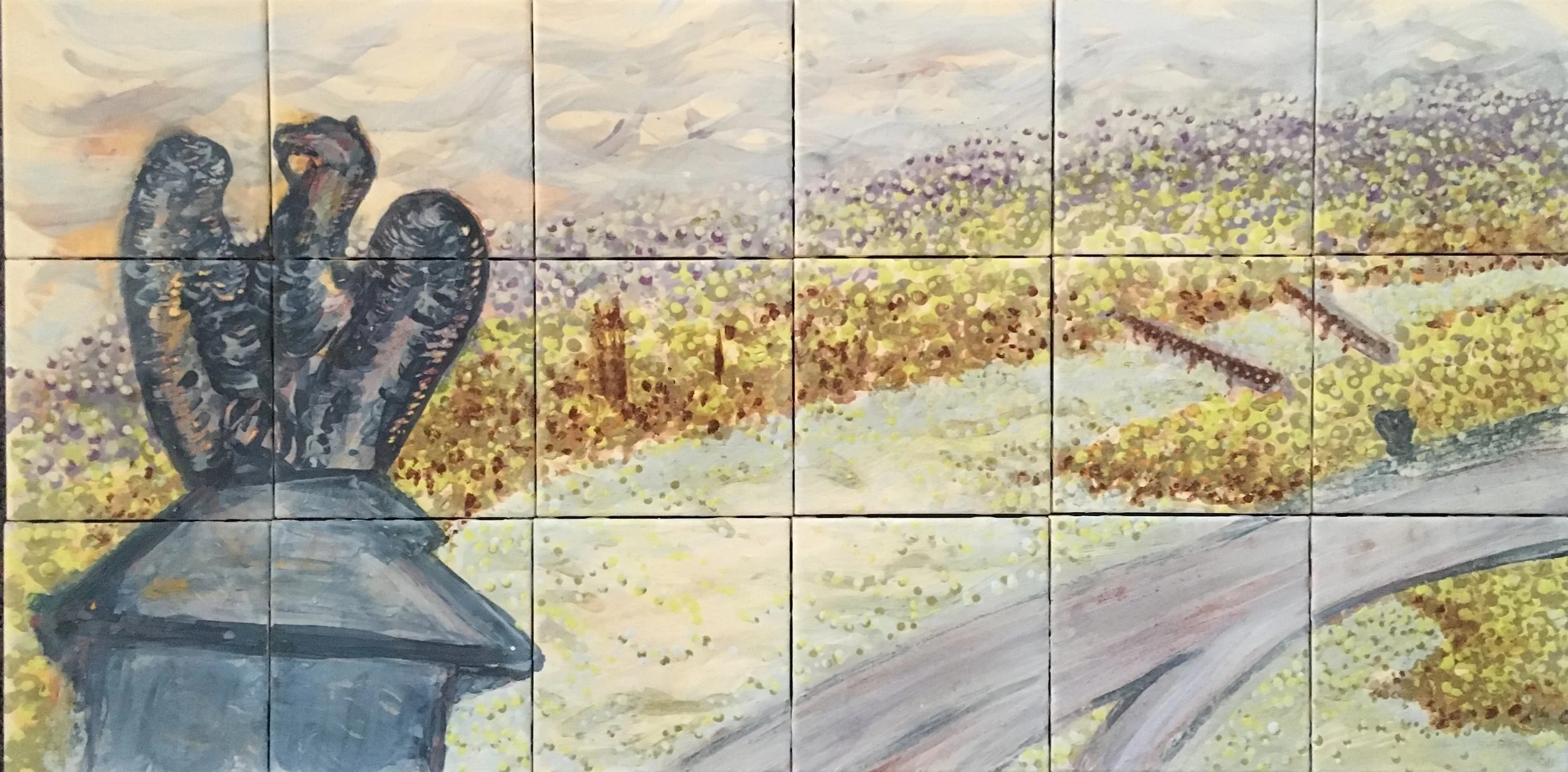 Detailed art, painted with underglaze before being baked in the kiln. Can be mounted or installed as wall tiles.
